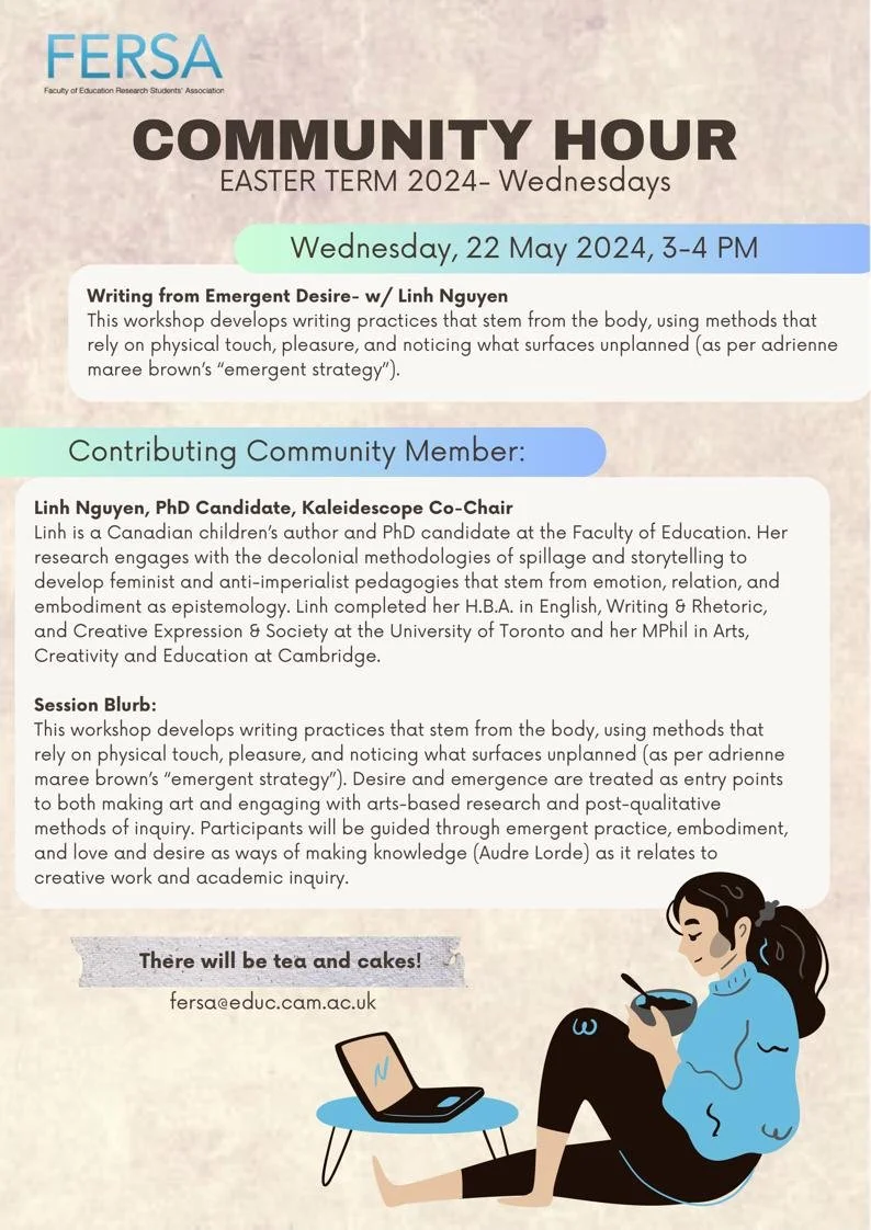 Join us for hot drinks, snacks, and writing exercises with PhD Candidate Linh S. Nguyen at Cambridge’s Faculty of Education this Wednesday. All are welcome!