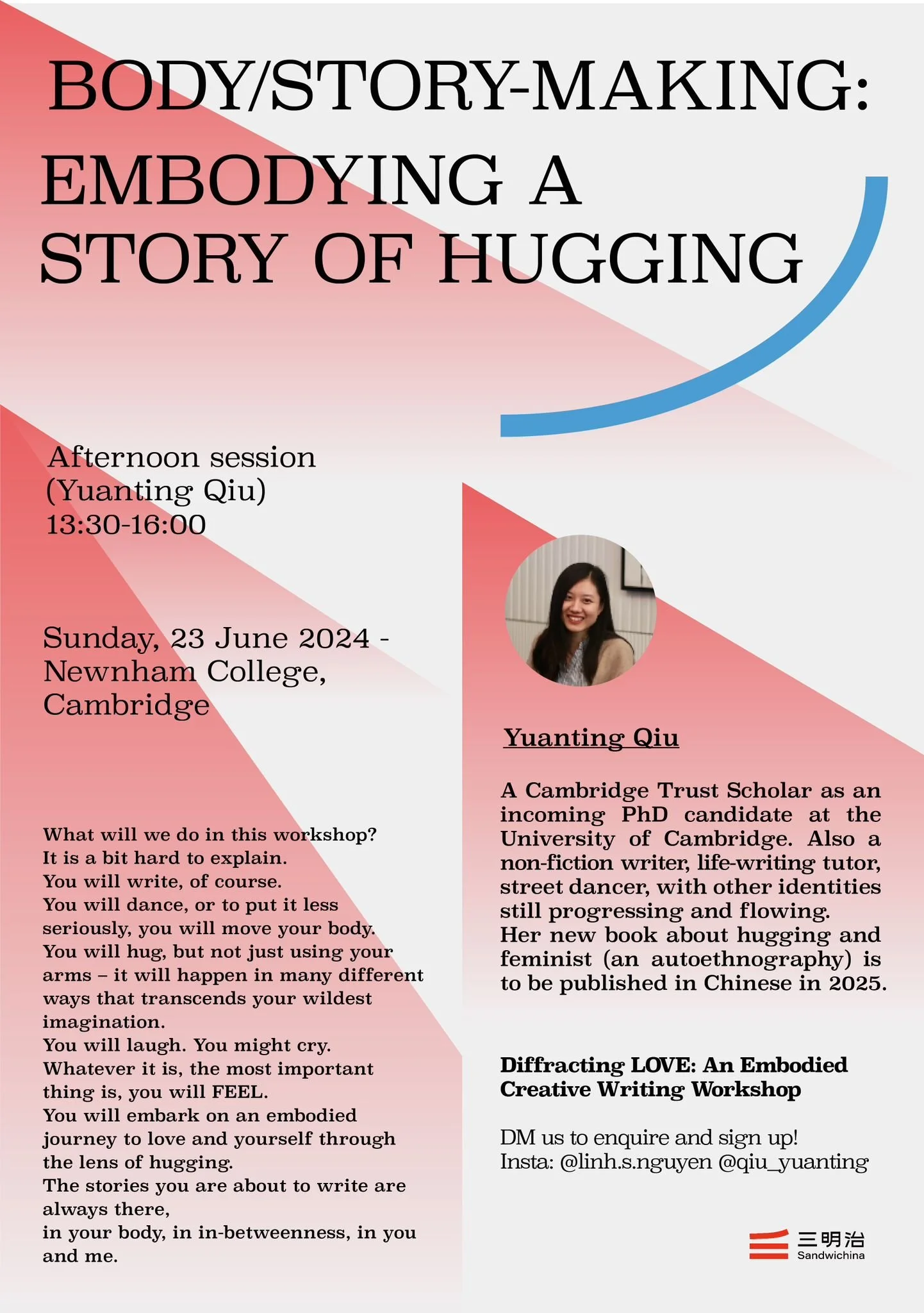 Yuanting Qiu is a Cambridge Trust Scholar as a PhD candidate at the University of Cambridge. Also a non-fiction writer, life-writing tutor, street dancer, with other identities still progressing and flowing. A strong advocate for writing from life, love, and heart. So far her life has been evolving around writing/words and dancing/body movements (and many other diverse interests), thus her research took shape from diverse personal experiences. Her new book about hugging and feminist (an autoethnography) is to be published in 2025.