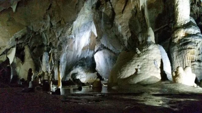 After venturing through many more caves with interestingly shaped rocks -- many of them looked like evergreen trees covered in snow -- we stepped out into the abyss. It was a breathtaking sight, like something out of a movie. There was a pond of dark turquoise water surrounded by rocky cliffs with trees ringing the top, and the sun and sky were visible above.