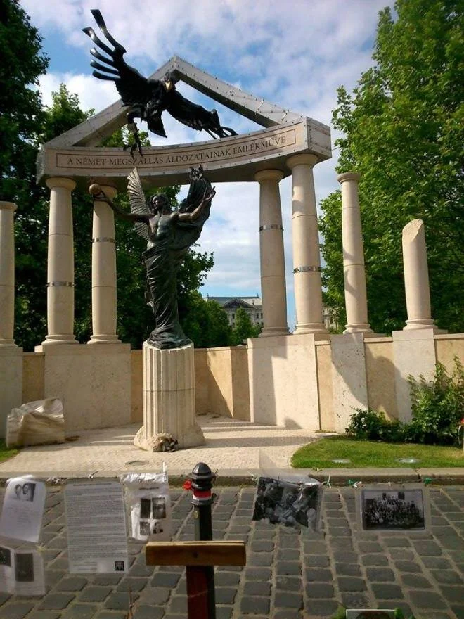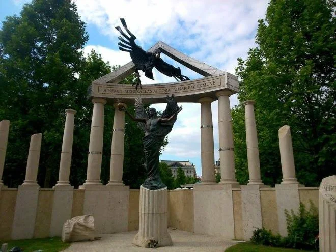 It portrays an angel in distress, representing Hungary, and an attacking eagle with 1944 on its ankle, representing Germany. The statue is meant to portray Hungary as a victim of Nazi Germany during the Second World War, when they were in fact allies. This re-writing of history, which attempts to absolve Hungary of all crimes, is so controversial that a counter-monument is set up permanently right in front of it.