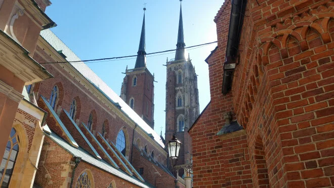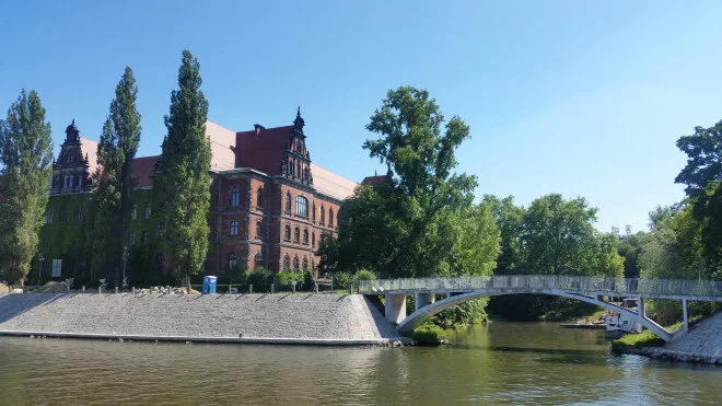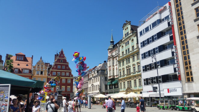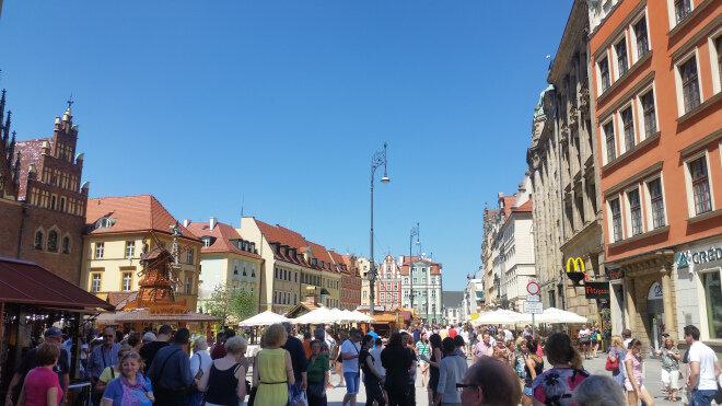 After a 5:45 wake-up and a six hour train ride with two exchanges, we arrived in Wroclaw, Poland to sunny 30o C heat. We had half an hour to check in, then went off on a five hour long walking tour. Our local tour guide -- dressed in a red hat, red pants, and white Canada T-shirt -- was very nice and knowledgeable, however, the weather was not in his favour. For the second half of the tour, all I could think about was how much I needed water.
