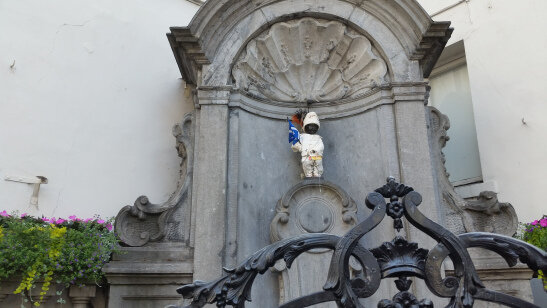 Our first stop on the tour was at the Manneken Pis statue, a tiny fountain of a small boy peeing, and a renowned landmark of Belgium. The statue is dressed in various costumes several times a week and even has his own personal tailor. While there are many different stories about the origin of the boy, the most famous one takes place in the 12th century. The two-year old boy, Duke Godfrey III of Leuven, was placed in a tree by his troops for protection from an invading army. From the top of the tree, the little lord urinated on the invading troops, who subsequently lost the battle. Our guide told us how occasionally, a beer keg would be hooked up to the fountain and passerby could enjoy free beer from the peeing statue.