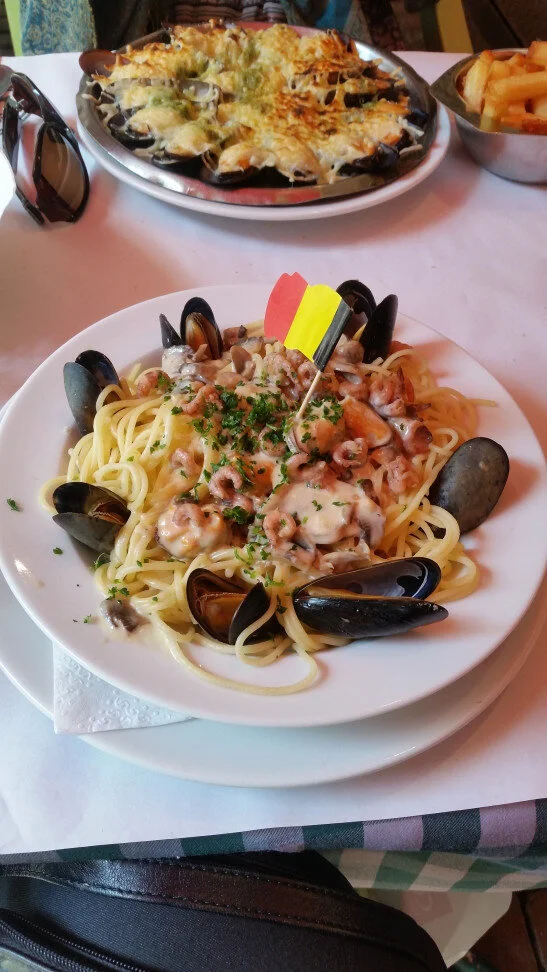 We found a place that our guide had recommended called Chez Leon. It was one of the best meals of my life. I had Belgian fries and gratin mussels -- mussels baked in cheese, butter, garlic, and oil -- and Julie had a seafood pasta. It was divine.