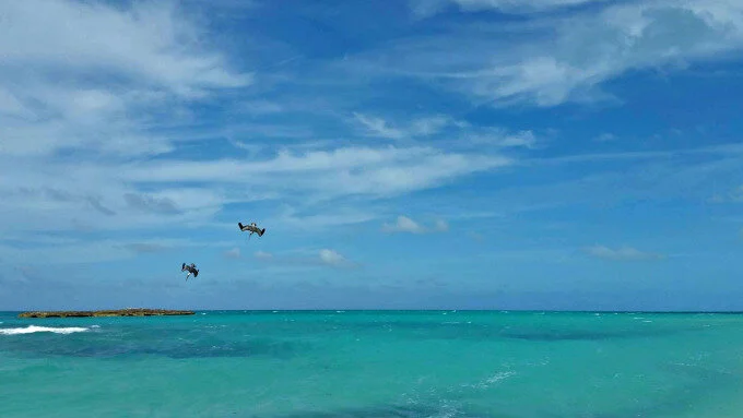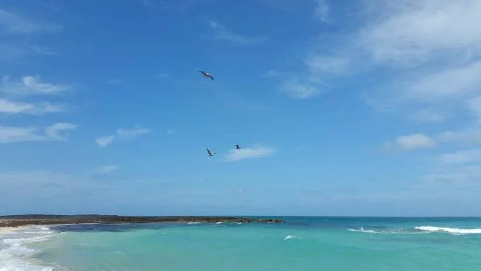 I'd never seen pelicans before this trip, and certainly never this close up. Back on our beach, when swimming, some had already flown quite near me, their wingtips occasionally brushing the rearing waves. Some had even swum with me, just a few feet away. At their home on the rock, however, I was able to see them dive -- a sharp and elegant plummet. In the water, we could also see glimpses of the long, silver fish that were the pelicans' prey.