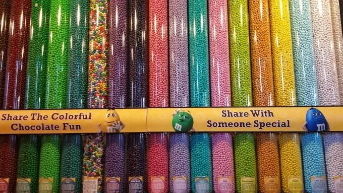 After sitting there for a while, we went across the street to check out the three floors of the M&Ms store. The walls were fun to look at -- there were dozens of options -- but we resisted buying more food. We also glanced into the Hershey's Store nearby, but it wasn't nearly as impressive.