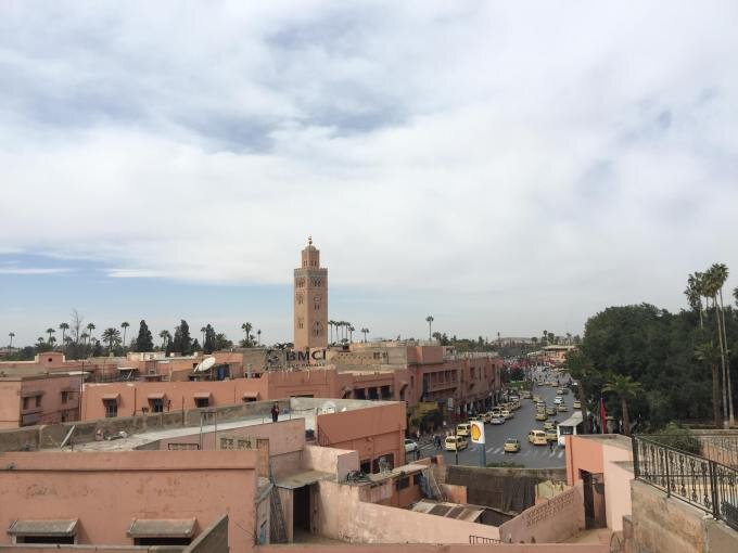 Lunch for me was a Moroccan soup, salad, and kefta (meatballs) grilled on a skewer with fries -- one of the better meals I've had this week. We sat on a rooftop patio overlooking Marrakech as we ate.